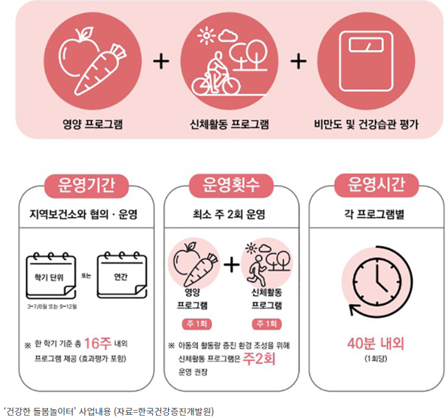 ‘건강한 돌봄놀이터’는 올바른 식습관 형성 및 신체활동 증가 등 건강생활습관 정착을 통해 아동의 건강한 성장환경 조성 및 아동비만을 예방하기 위한 것이다.